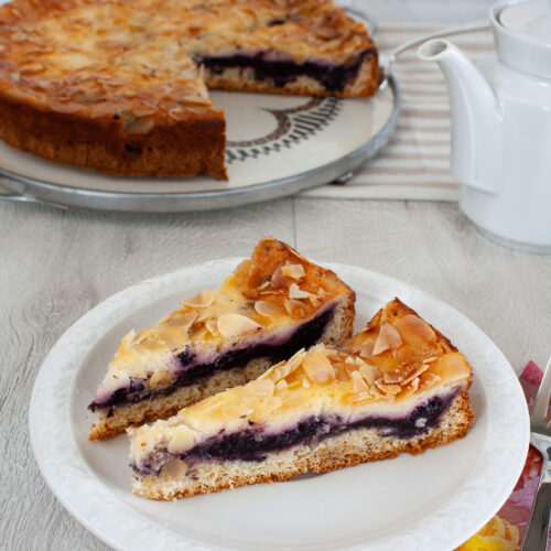 Der Kuchen selbst ist genauso gut, wie ich ihn in Erinnerung hatte: ein unkomplizierter Quark-Öl-Teig bildet den Boden, darauf säuerliche Waldheidelbeeren (die kleinen wilden, keine gezüchteten Riesen), getoppt mit einer cremigen Schmandmasse und ein paar Mandelblättchen für den goldenen Crunch.