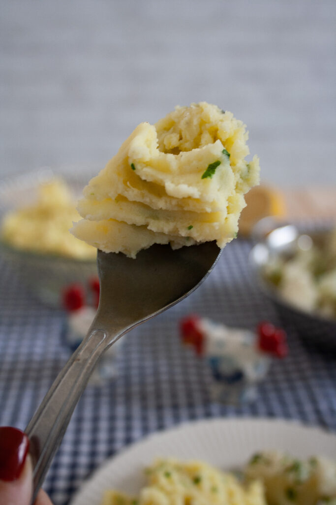 - Kartoffeln bis zur gewünschten Konsistenz stampfen – entweder mit einem Kartoffelstampfer oder einer Gabel.